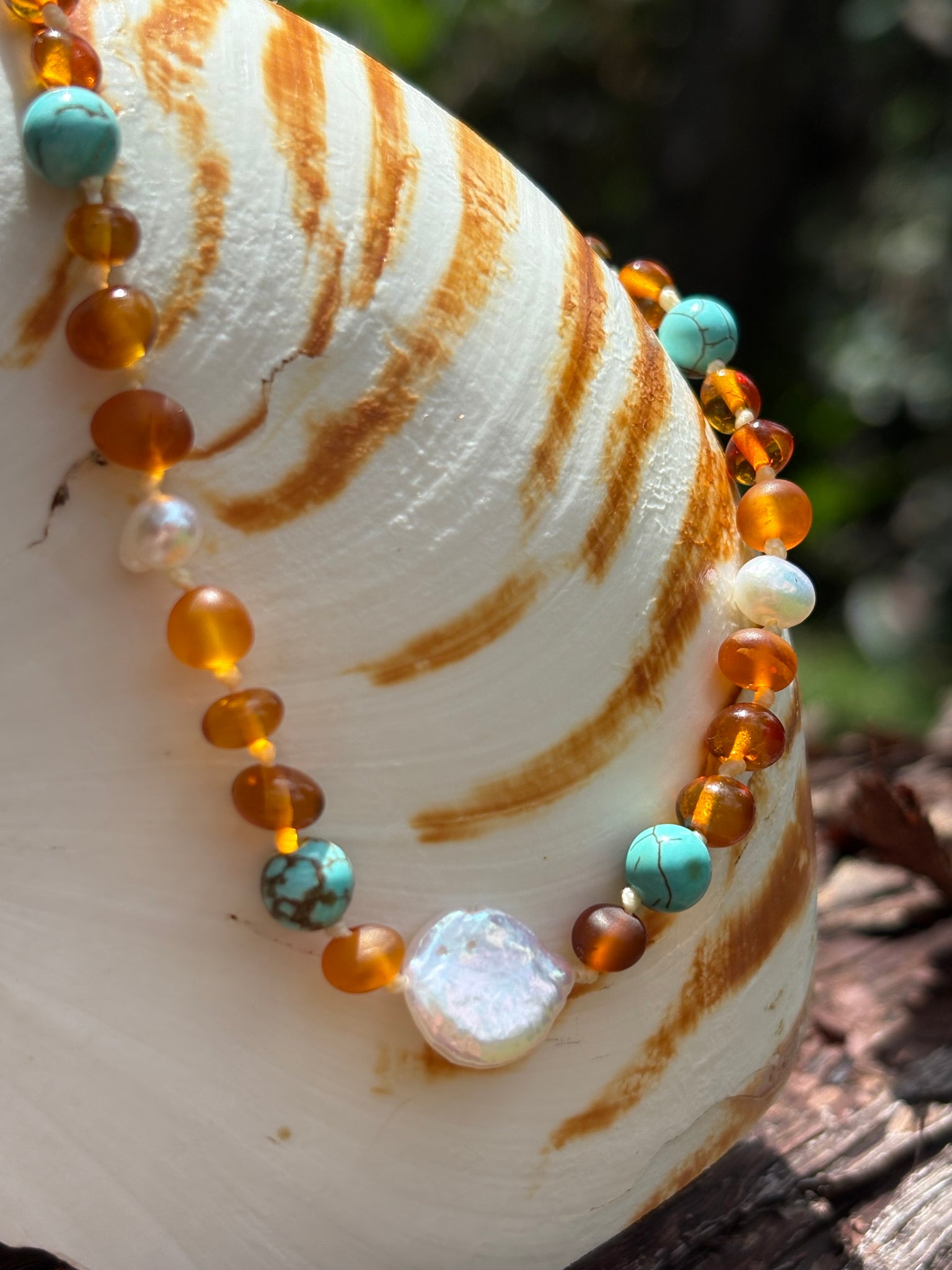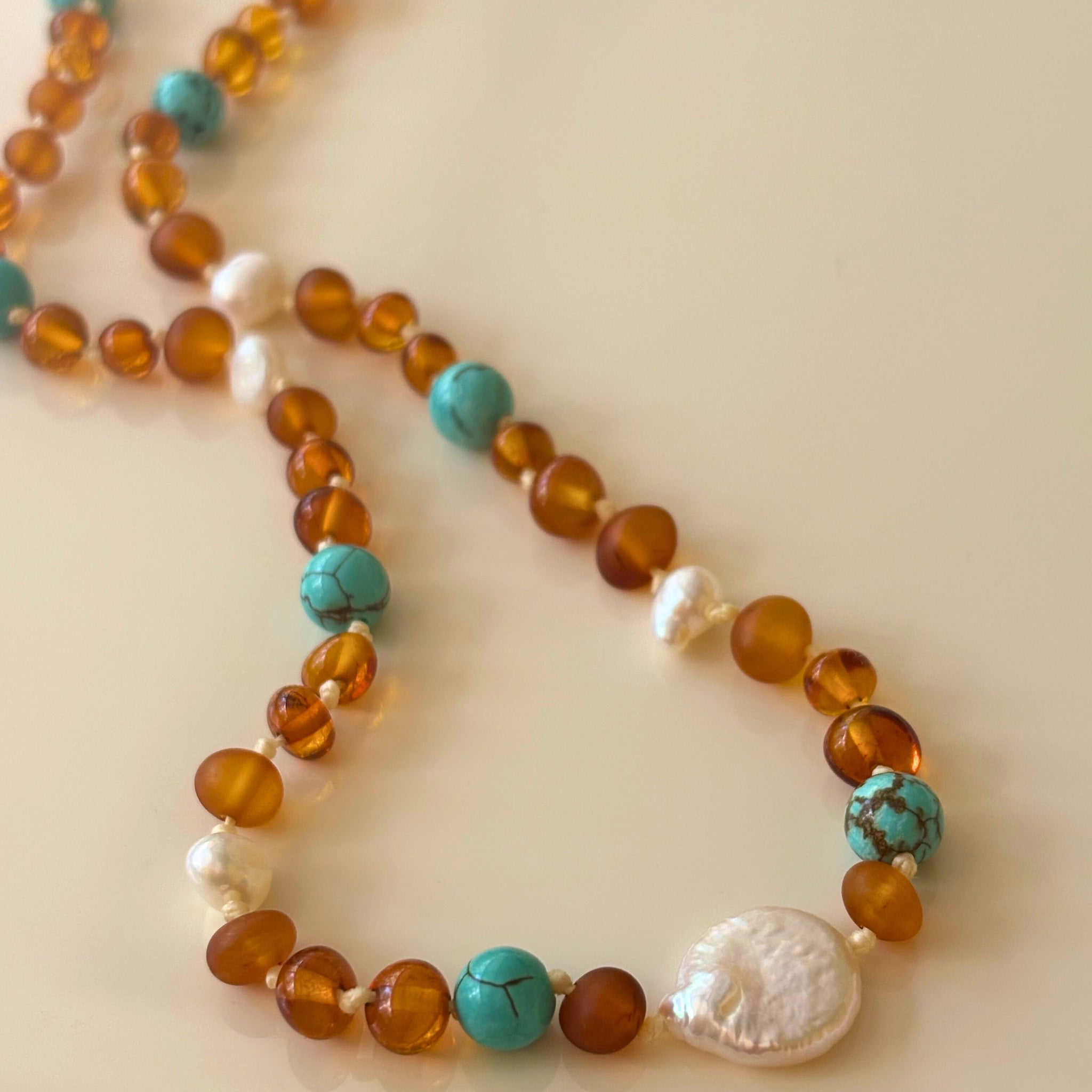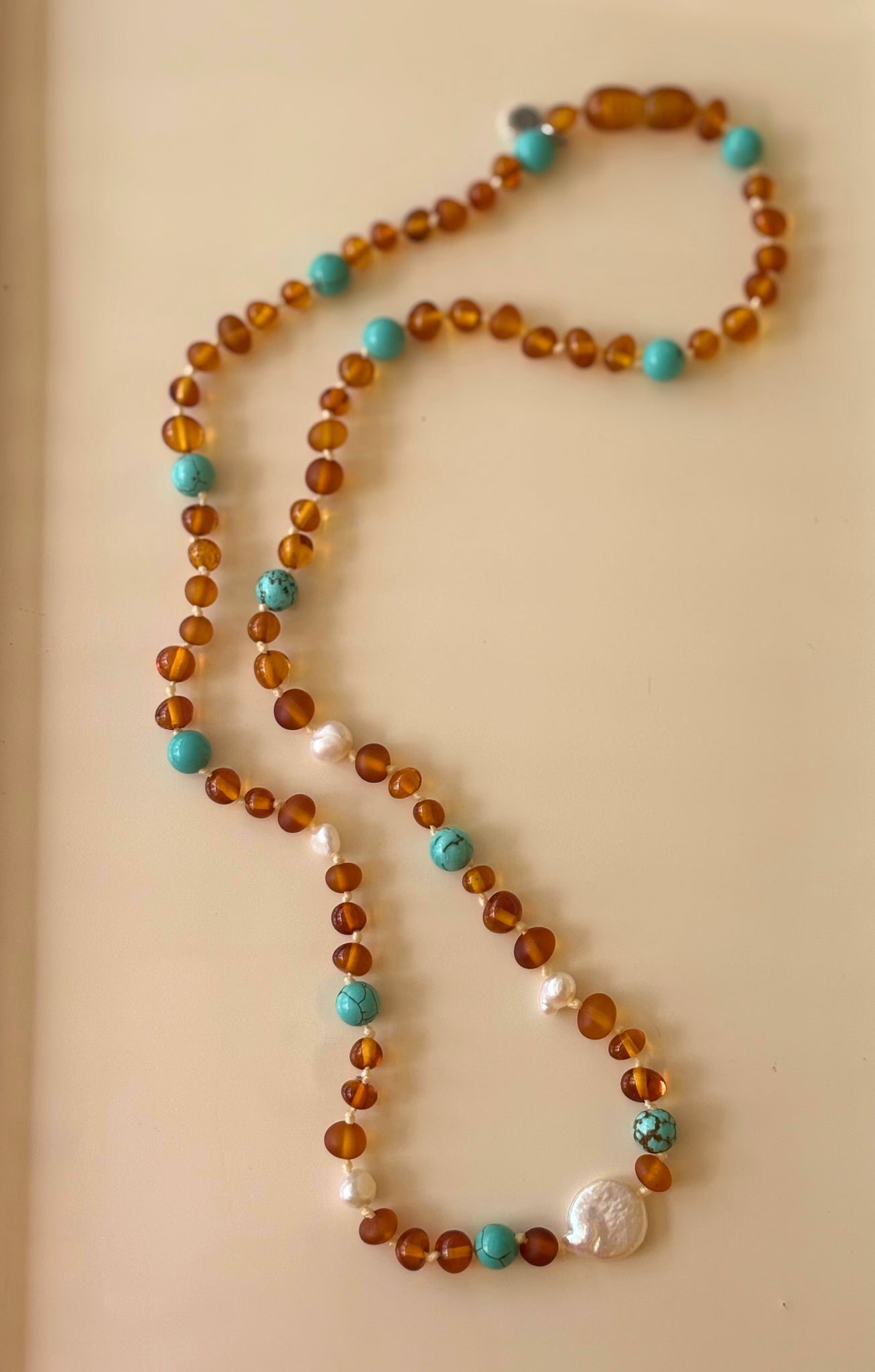 Each piece is handmade and therefore unique so may vary in size and appearance. It features a screw safety clasp and is knotted for safety and piece of mind.