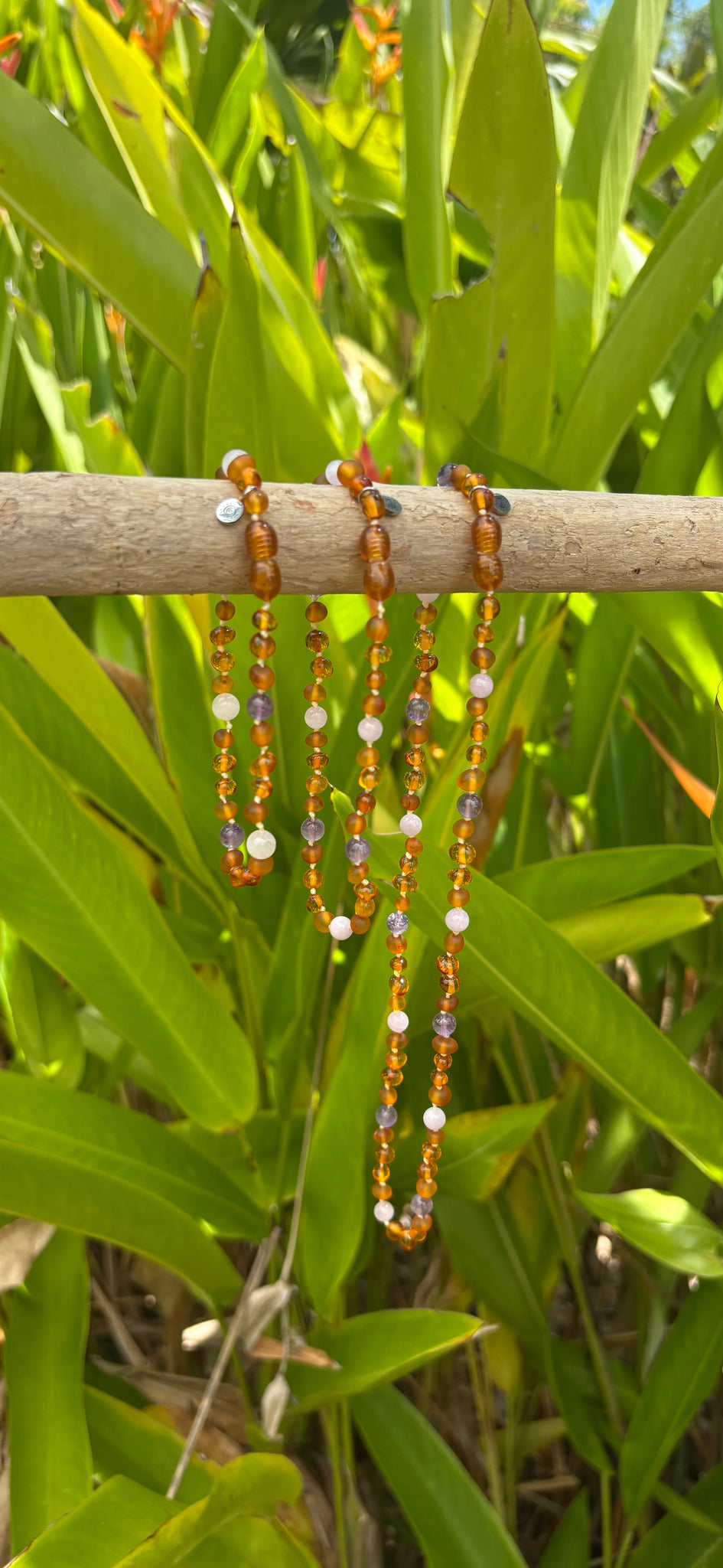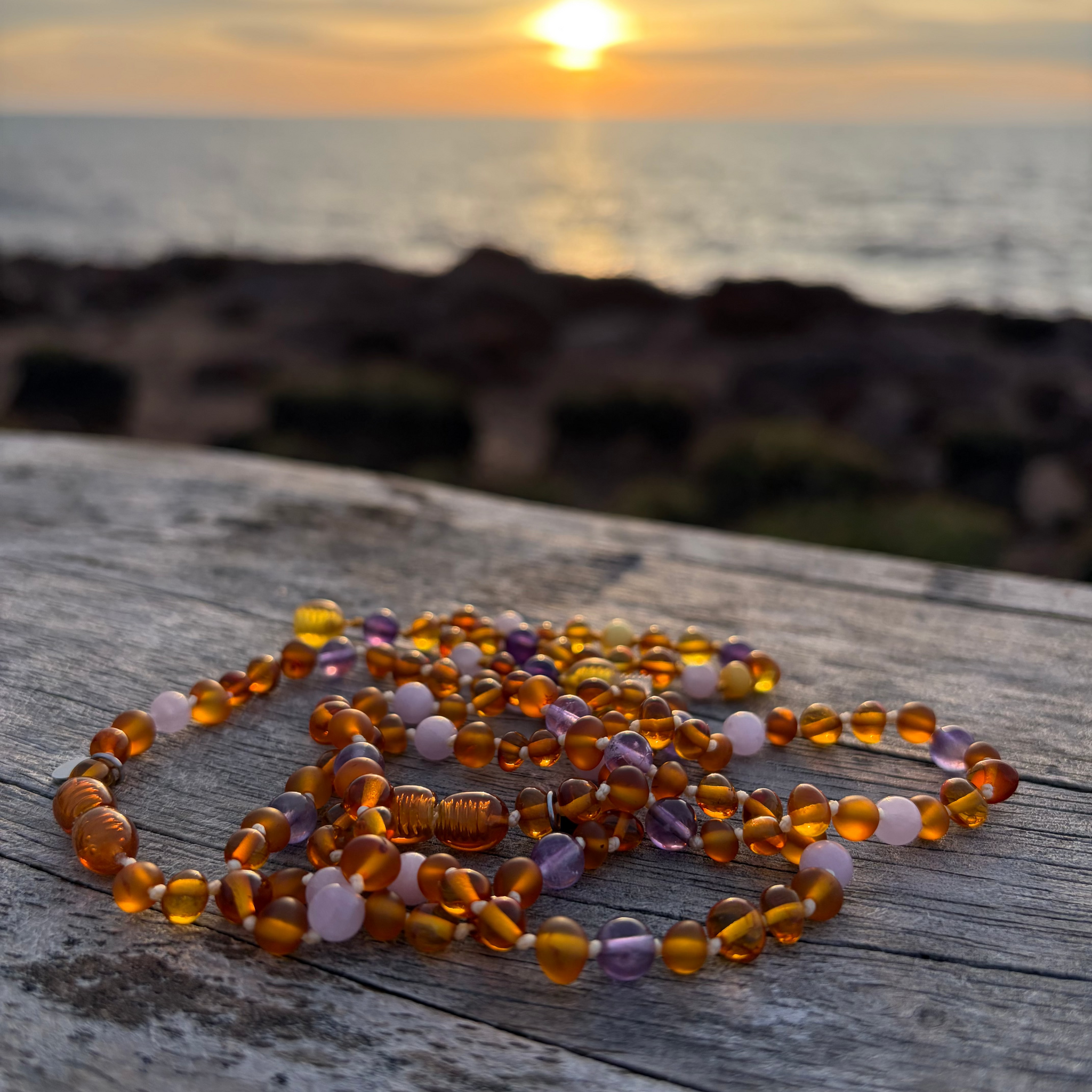 ‘The Golden Hour’ is designed with Polished & Raw Cognac Amber along with Amethyst & Rose Quartz.